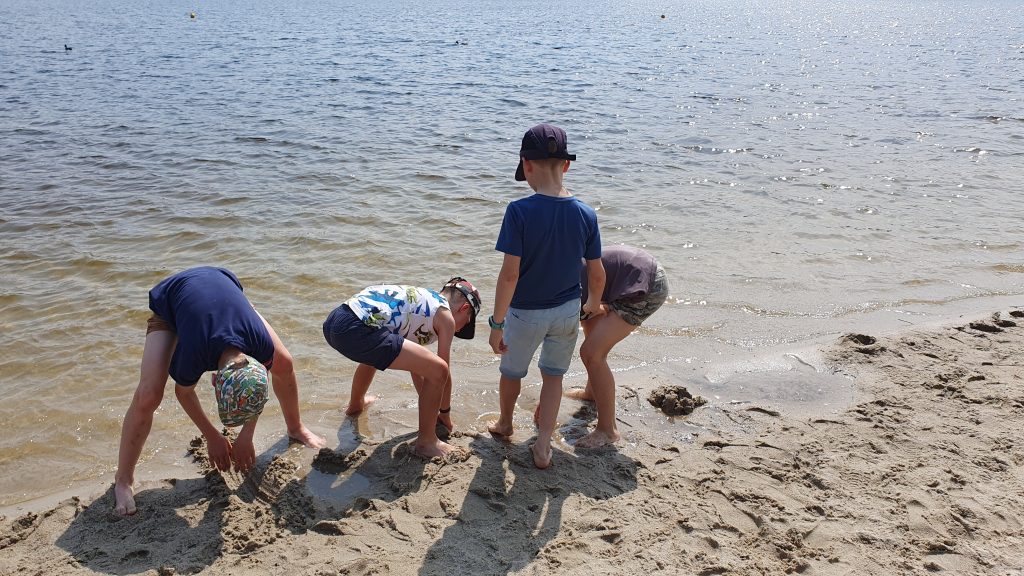 Nach dem Mittagessen ging es auf Schatzsuche. In Kleingruppen aufgeteilt und mit Kompass und Hinweisbriefen ausgestattet, ging es los. Manch ein Weg führte zwar in eine Sackgasse, aber am Ende fanden alle Gruppen ihren Schatz. Zwischendrin gab es auch eine Mutprobe zu bestehen, die alle Kinder mit Bravour gemeistert hatten. Auf dem Rückweg zur Jugendherberge tobten wir auf dem Spielplatz und bauten Burgen am Strand. Am Abend gab es Stockbrot am Lagerfeuer und eine Nachtwanderung. Herr Schmidt erzählte spannende Geschichten aus der Region und auch hier mussten alle wieder eine Mutprobe bestehen. Zurück in der Jugendherberge fielen alle geschafft, aber zufrieden ins Bett.