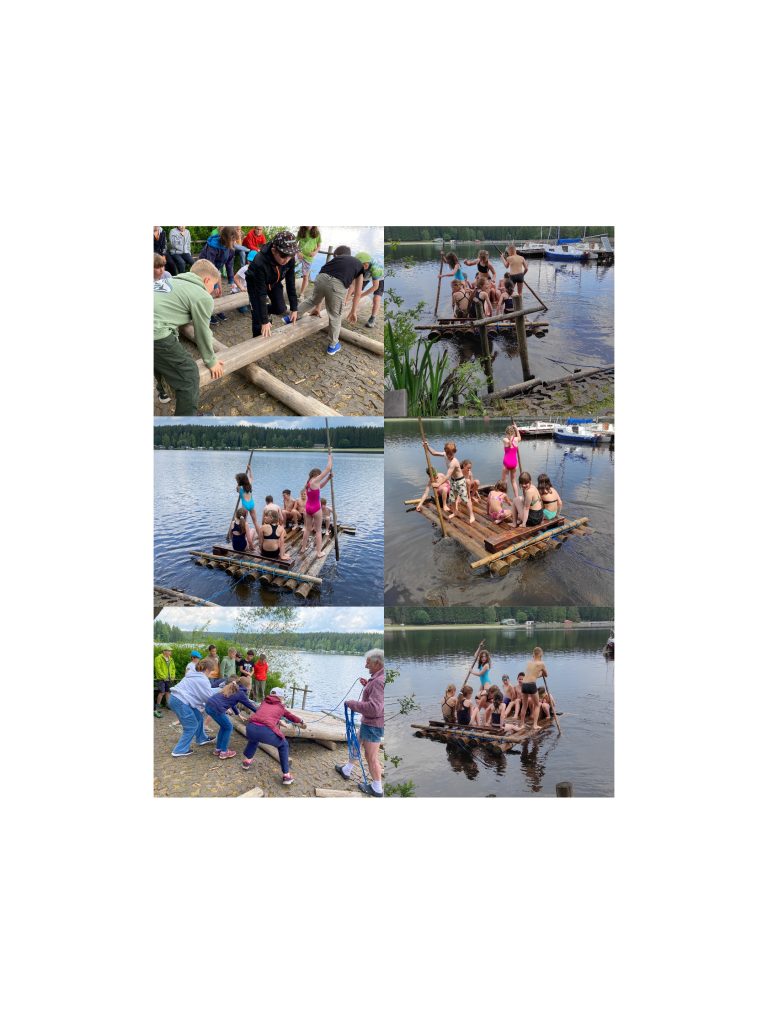 Nach dem Mittag sind wir durch den Wurzelwald gewandert. Beim Floß bauen haben wir richtig viel gelernt. Die erste Gruppe hat die Rollen und zwei Stämme daraufgelegt und mit einem Seil straff zusammengezurrt. So haben wir uns in vier Gruppen abgewechselt, bis das Floß fertig war. Wir tauften es auf den Namen SKL 4b (Superklasse 4b 😉). Dann ging es ab auf den Teich. Manche Kinder sind direkt vom Floß in den Teich gesprungen. Die letzte Fuhre war mit zehn Kindern etwas zu voll beladen. Das Floß hatte ganz schön Tiefgang. Es waren sehr lustige Floßfahrten.